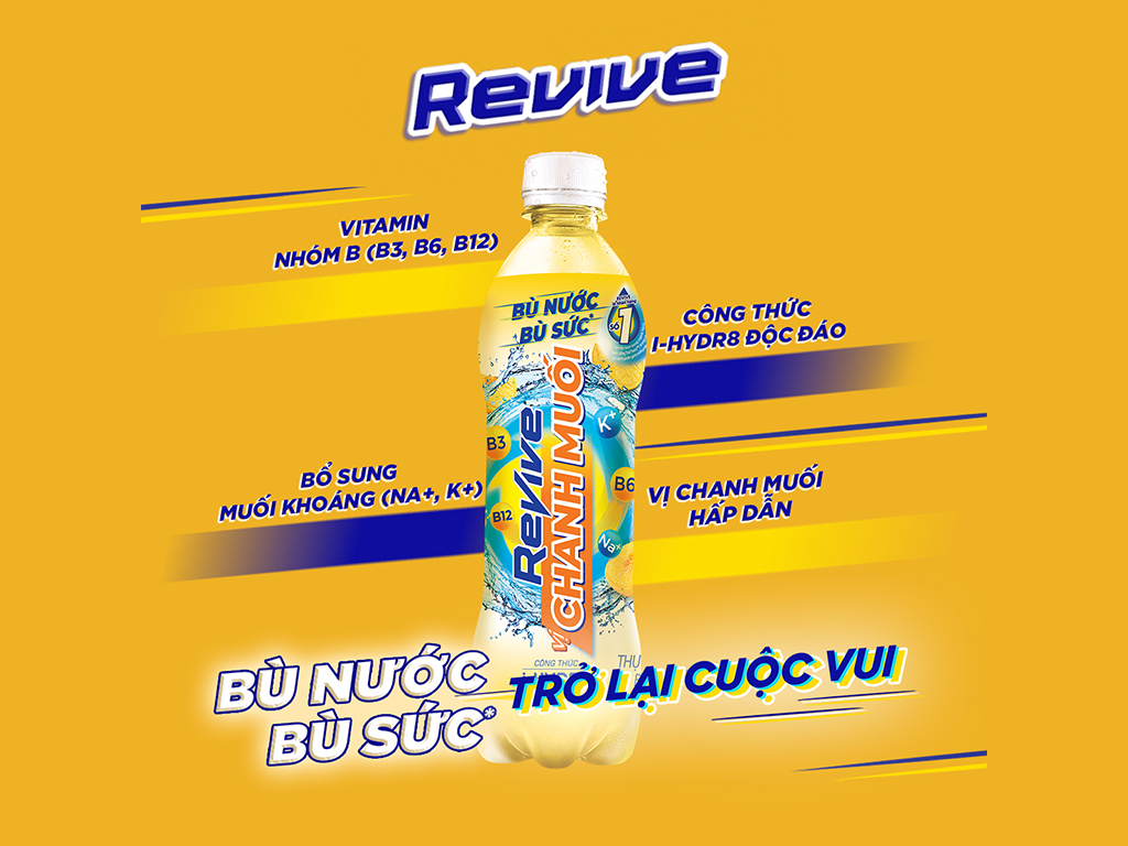 REVIVE Nước uống điện giải bù khoáng với hương vị chanh muối, với công thức i-Hydr8 độc đáo, ưu việt, bổ sung muối khoáng (Na+, K+) và các vitamin nhóm B (B3, B6, B12), giúp bù nước vượt trội, bù khoáng và bù đắp năng lượng, cho bạn trở lại cuộc vui năng động. Đặc biệt vị chanh muối ngon tuyệt thêm sảng khoái, đã khát và sảng khoái, bù nước và bù sức nhanh, cho bạn nhanh chóng trở lại cuộc vui năng động.